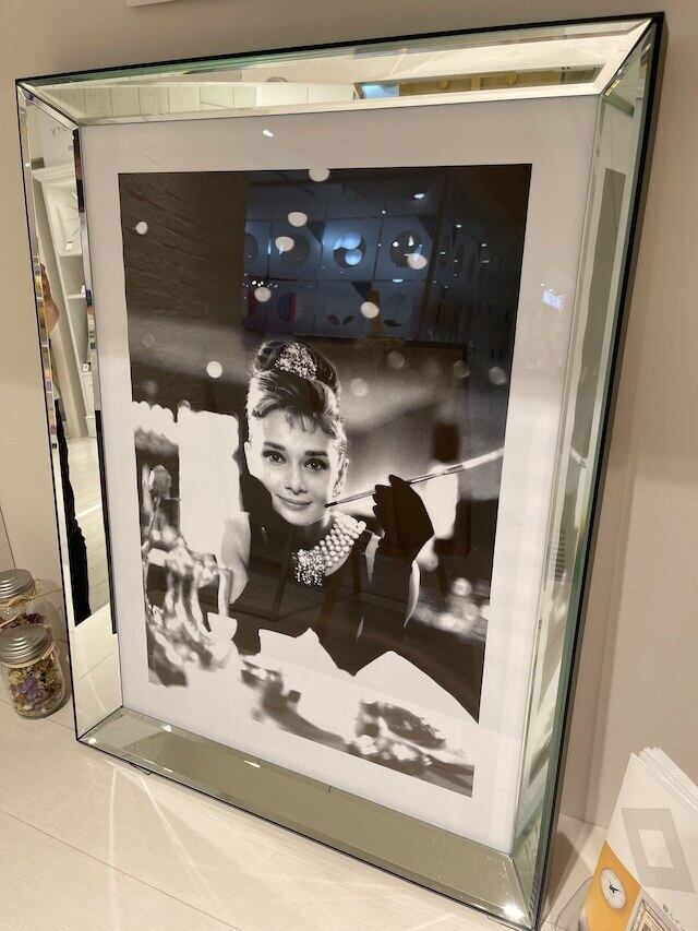 オードリー・ヘップバーンが永遠のアイコンとされる映画「ティファニーで朝食を」の名シーンを、豪華なミラーが施されたフレームで壁掛けインテリアとしてお楽しみいただけるアート作品。その美しさはまるで映画の中から飛び出してきたかのよう。イギリスより直輸入した逸品で、洗練された雰囲気をお部屋にプラスすること間違いなし。オードリーのエレガントな魅力に思わず見とれ、朝から幸せな気分にしてくれることでしょう。