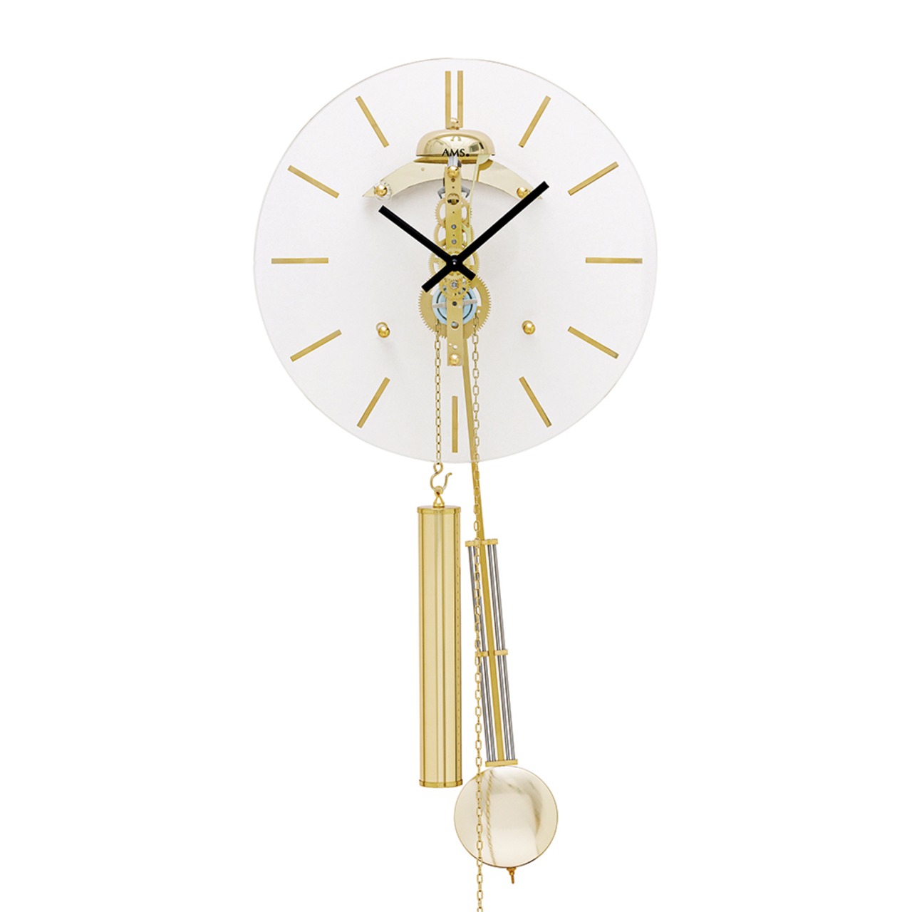 ドイツから直輸入したおしゃれな機械式掛け時計です。美しいゴールド仕上げとスケルトンデザインが、インテリアを一層引き立て、見る人の目を惹きつけます。分銅付きの振り子が、優雅な動きと共に時間を刻む様子は、まるで時を超えたアートのようです。