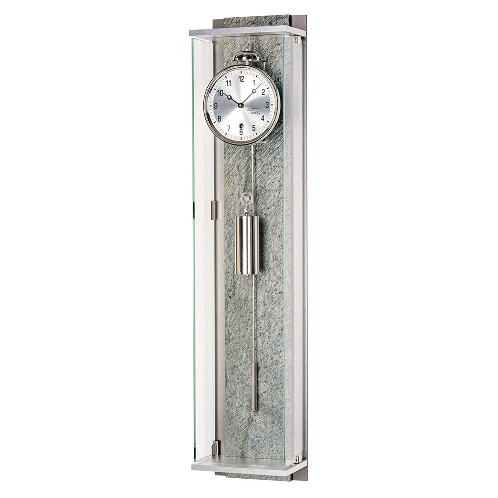 こちらの時計は、ドイツから直輸入されたエレガントなインテリアアイテムです。スリムなスタイルが特徴で、シルバーの文字盤とお洒落な振り子が見る人の目を引きつけます。