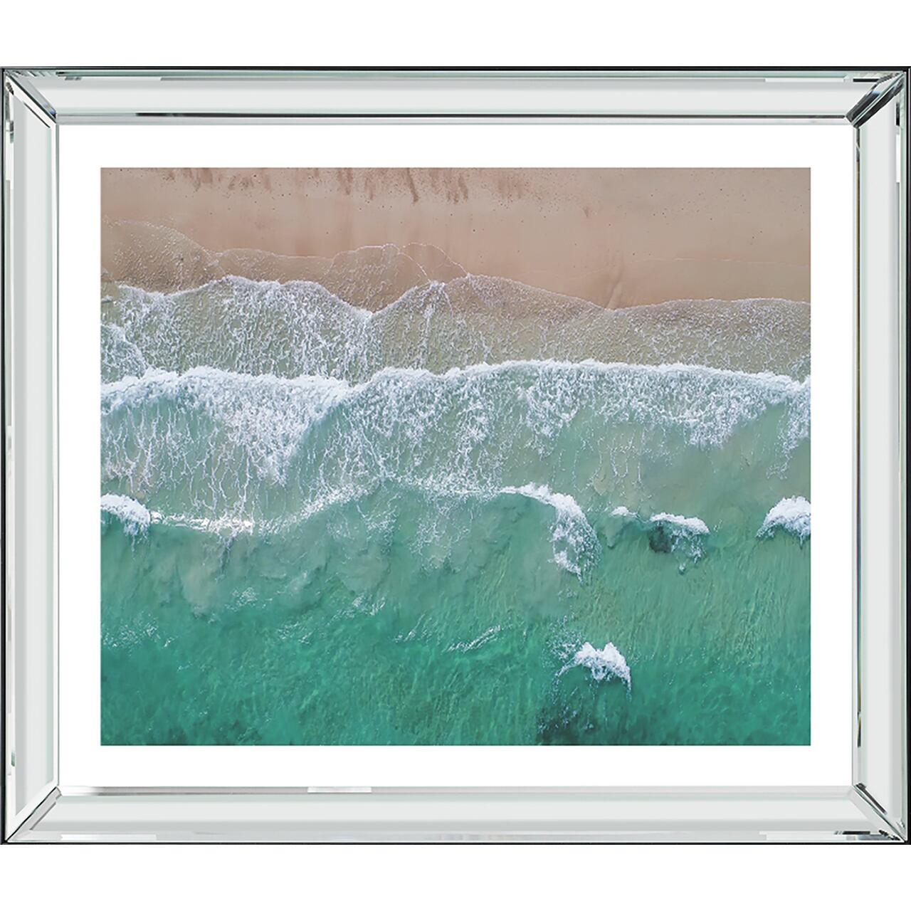 海岸の写真を印刷し、豪華なエッジ加工されたミラーが施された額縁にセットされたピクチャーアート。